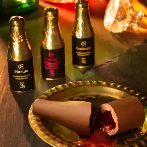 Caixa Clássicos Drinks 88 g — mini garrafinhas de chocolate ao leite recheadas com licores de drinks clássicos em uma embalagem elegante e divertida.