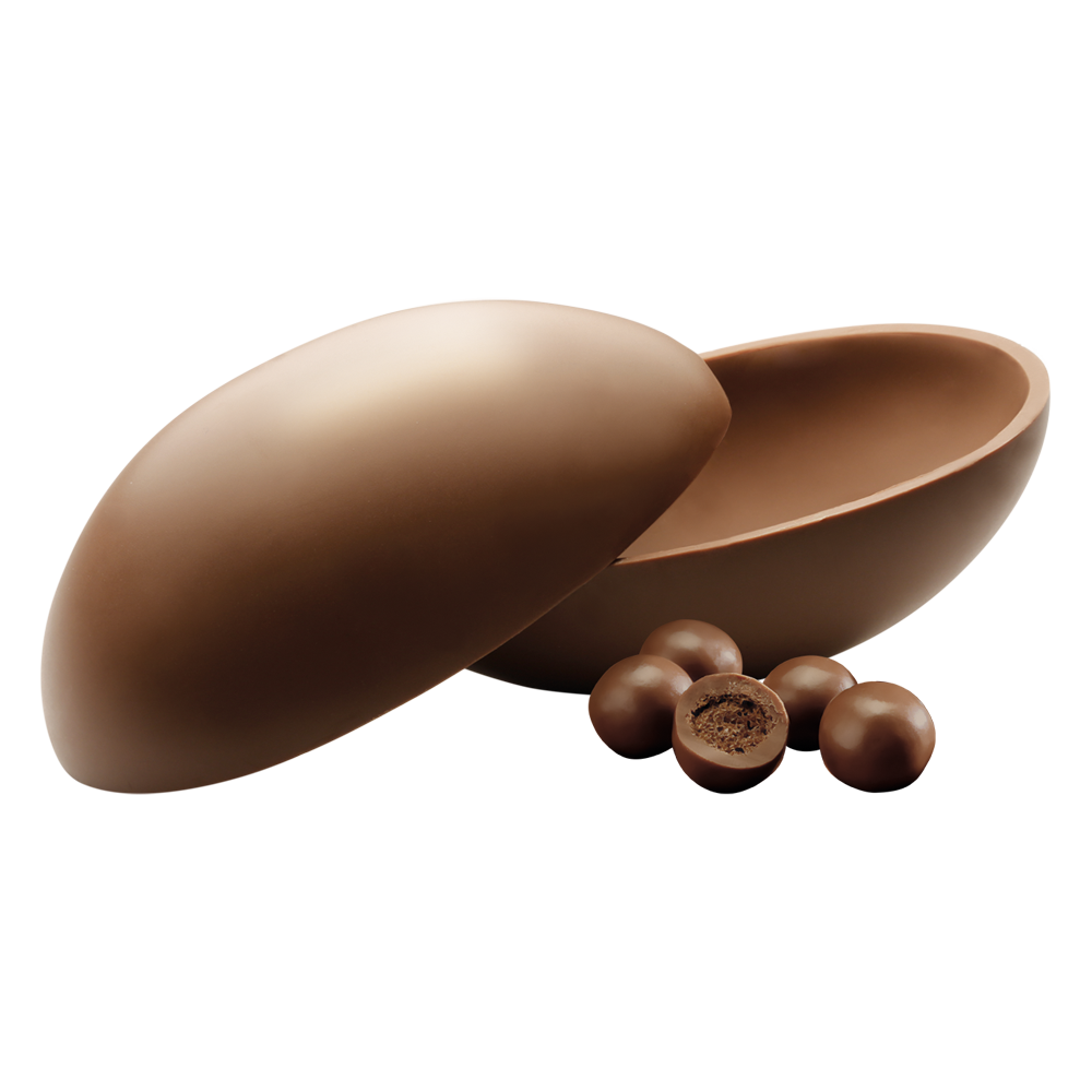 • Casca de chocolate ao leite com drageados crocantes de chocolate ao leite.