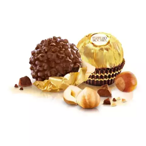 Ferrero Rocher, são bombons de waffer, coberto com chocolate ao leite com pedaços de avelã, recheado de creme de avelã com avelã inteira.